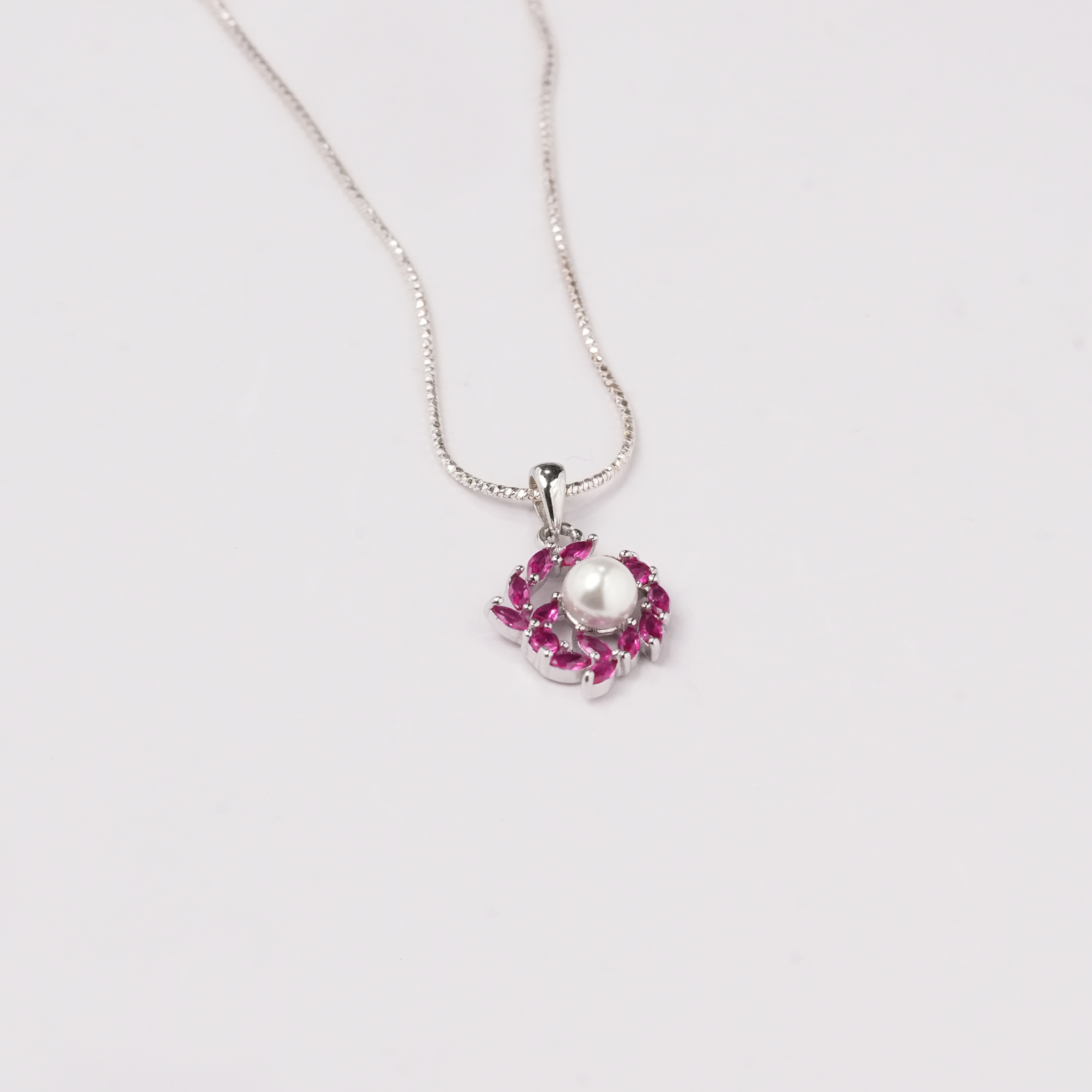 The Blush Bloom Silver Necklace features a central stone with a soft, captivating hue, surrounded by delicate silver work. This piece is designed to offer a gentle pop of color while maintaining a high-end, luxury feel.