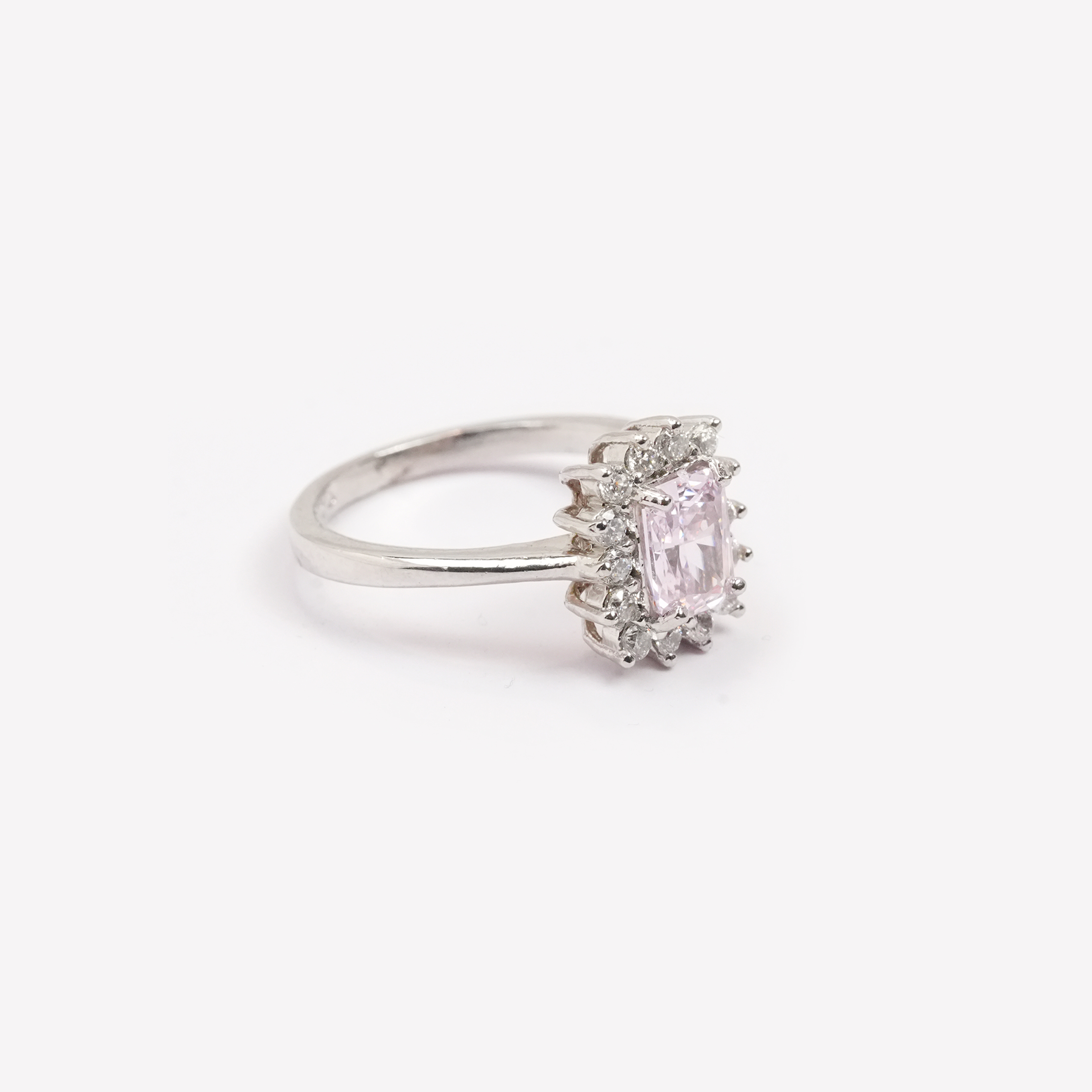 The Blush Aura Halo ring is designed to radiate warmth. The central stone is encircled by a shimmering halo of accents, creating a voluminous look that captures the soft, ethereal light of a morning sunrise.