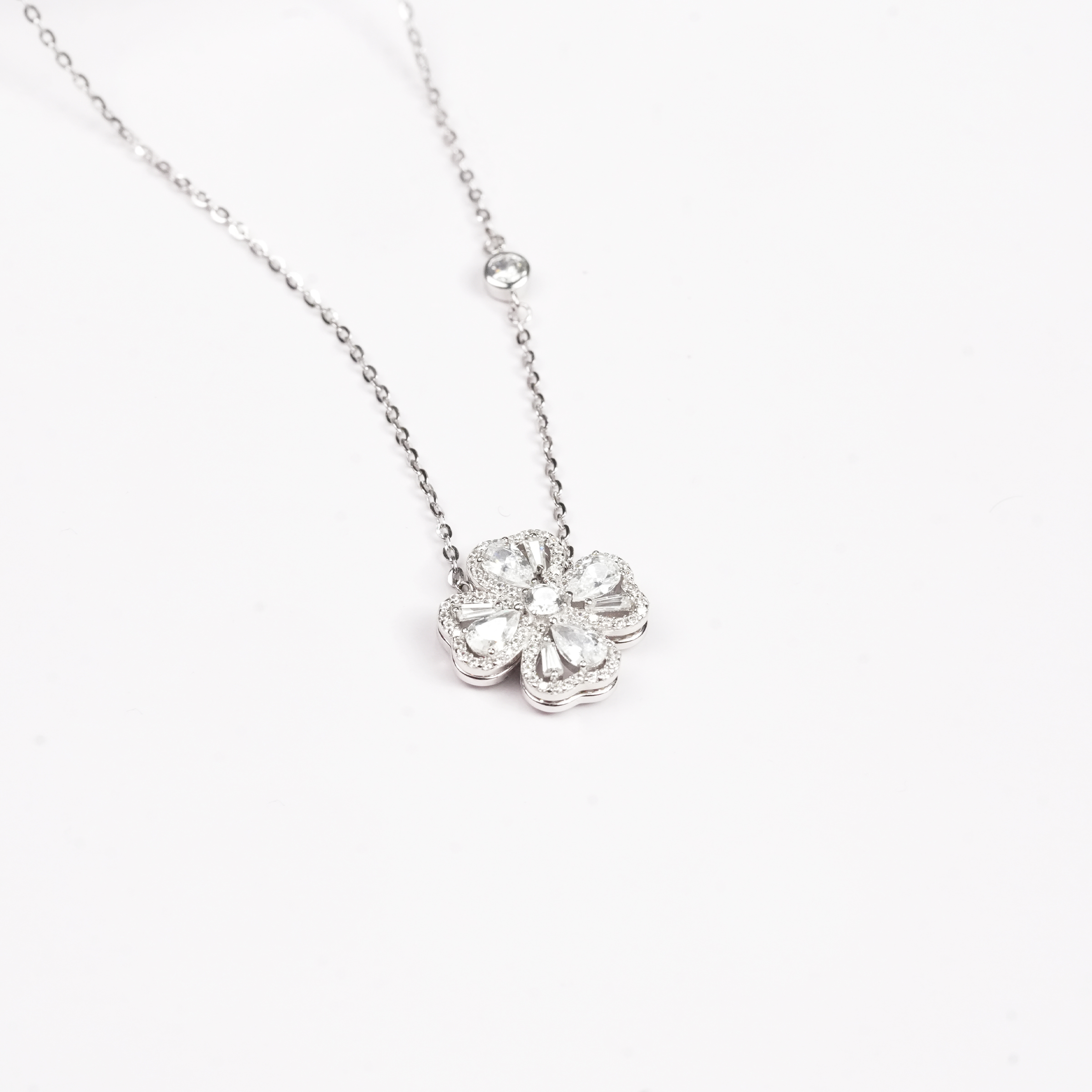 The Fiora Silver Necklace offers a modern take on floral designs with its sharp lines and brilliant stone placement. It’s a bold yet elegant piece that brings a contemporary edge to a classic botanical theme.