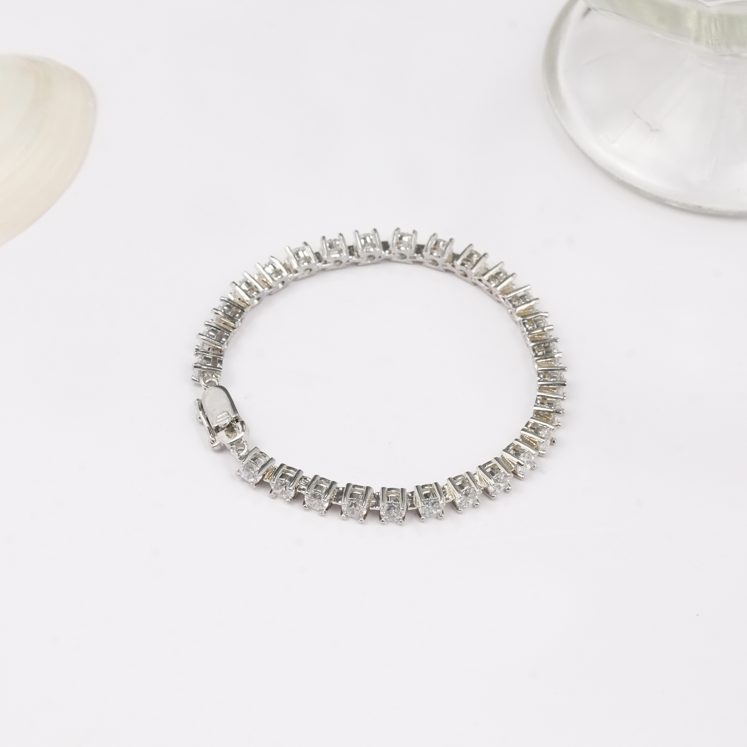 The Floral Crystal Silver Bracelet captures the delicate beauty of a blooming garden. Each stone is carefully arranged in a floral motif, creating a feminine and whimsical look that adds a romantic touch to any outfit.
